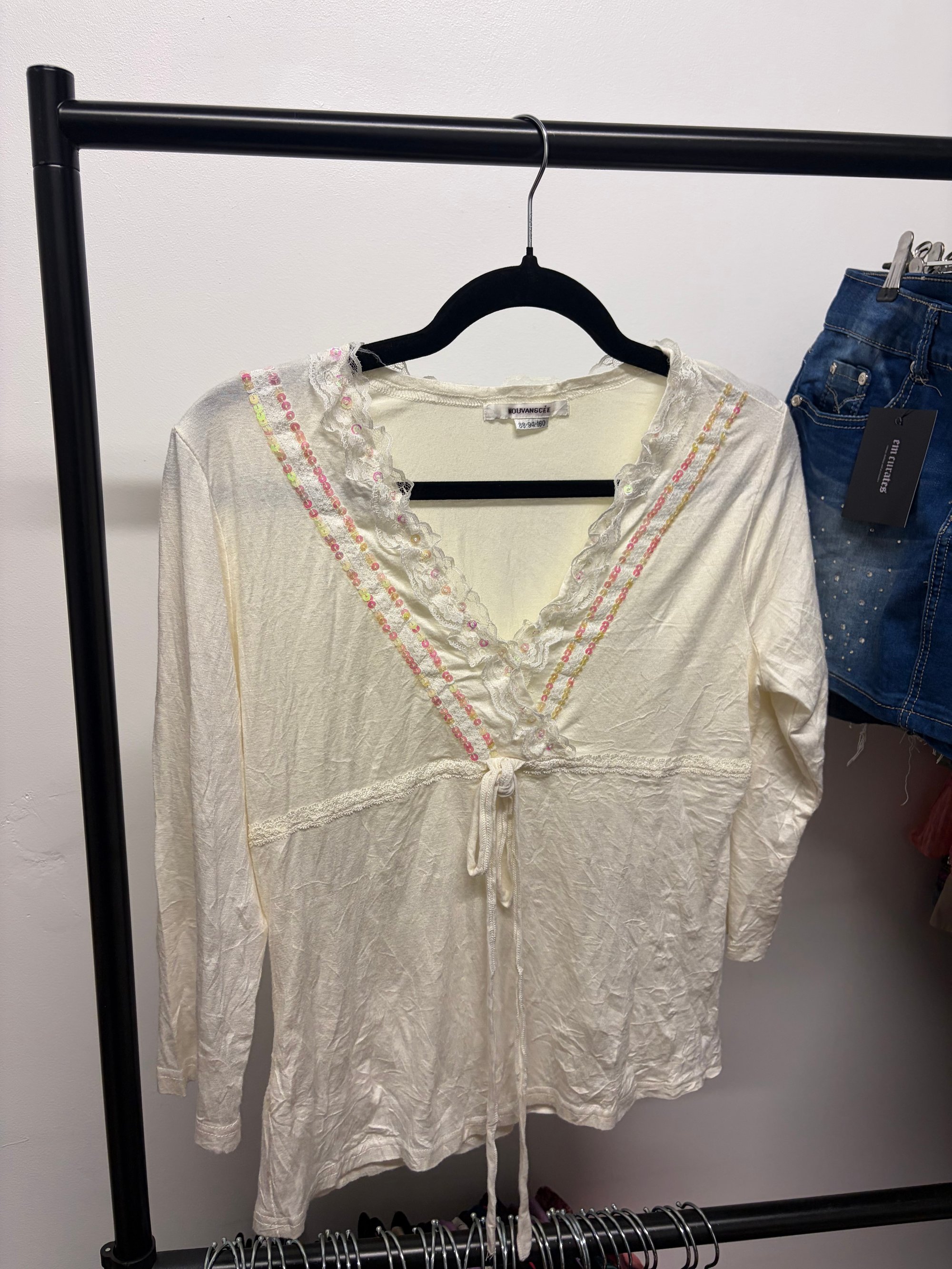 00s cream sequin long sleeve top with tie detail on bust
