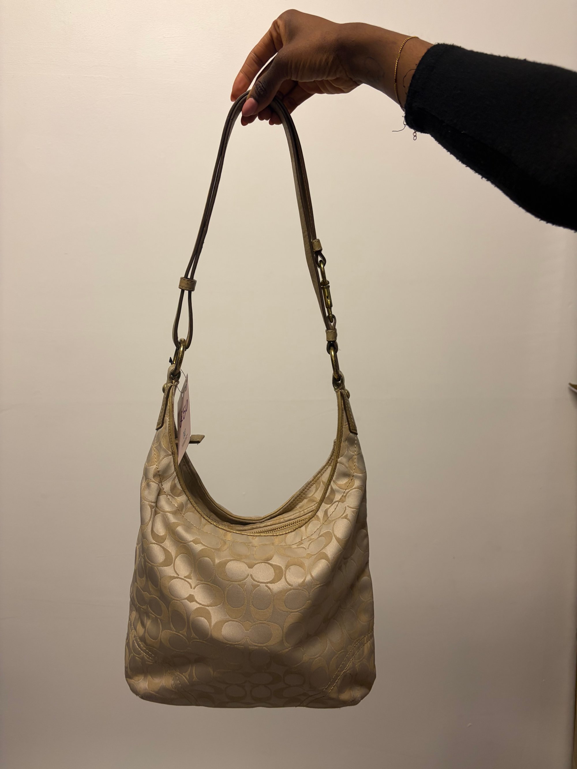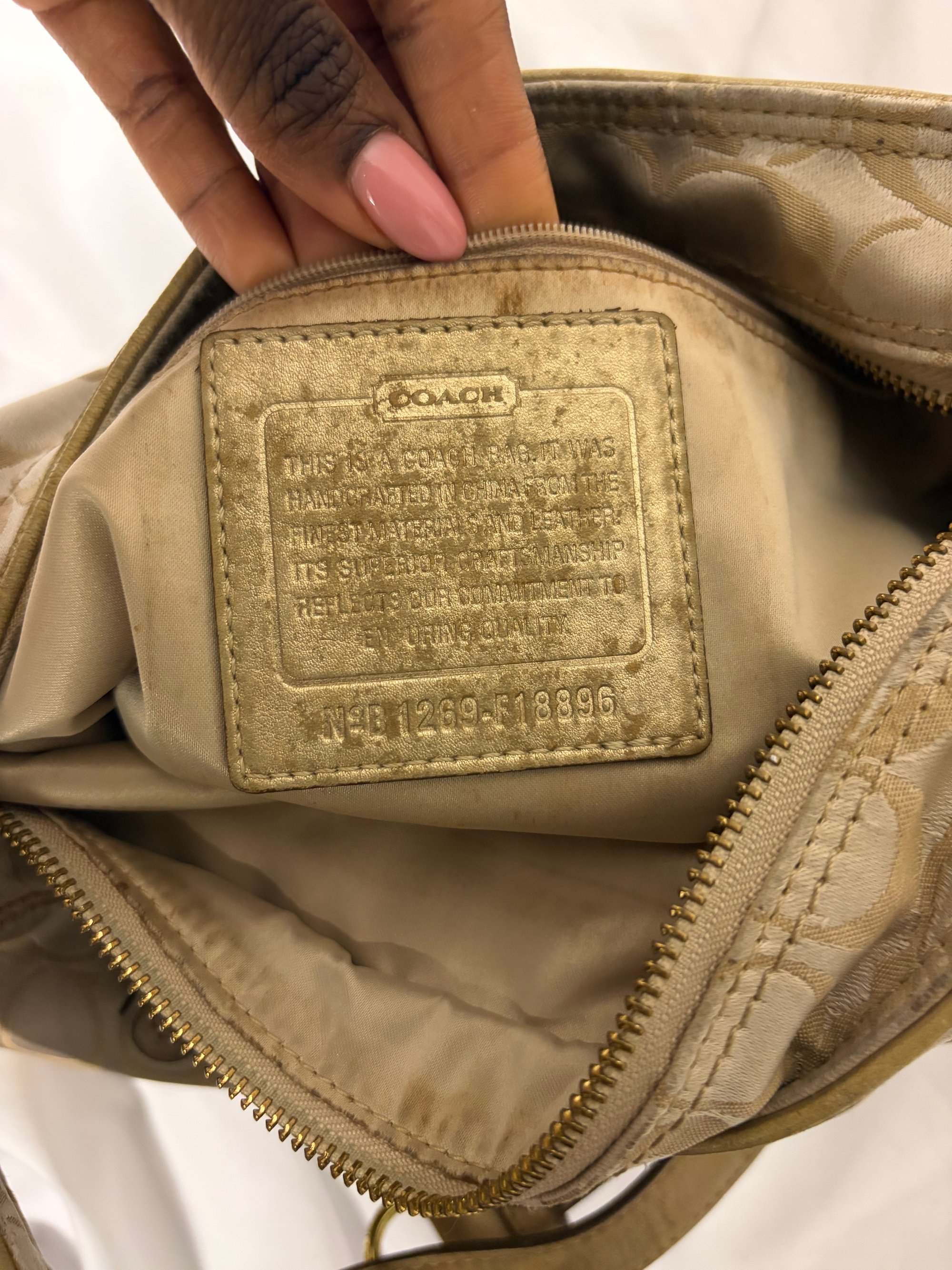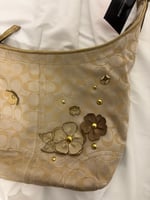 2012 Coach monogram hobo shoulder bag with a beige and gold floral appliqué design