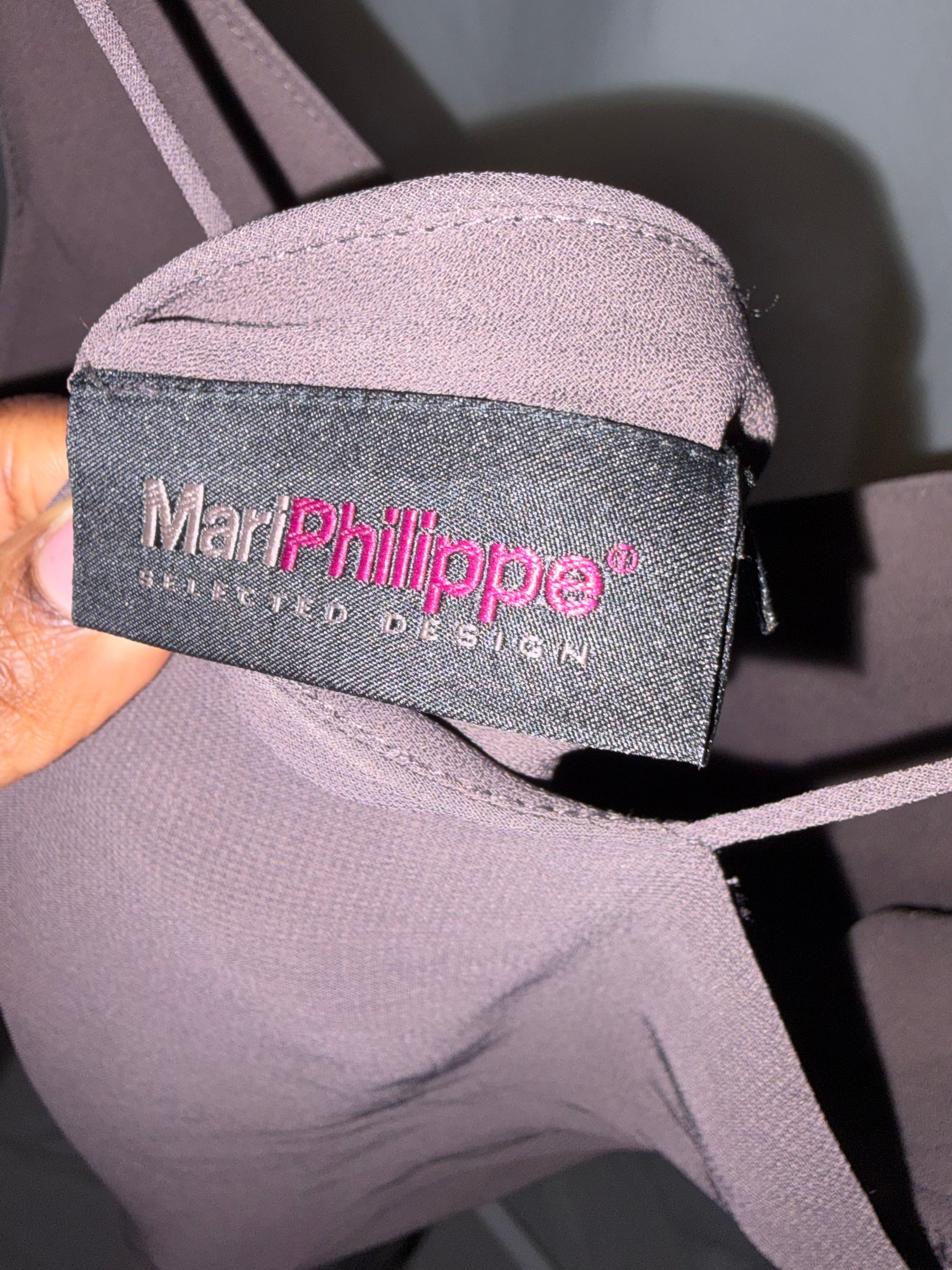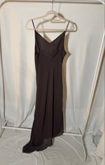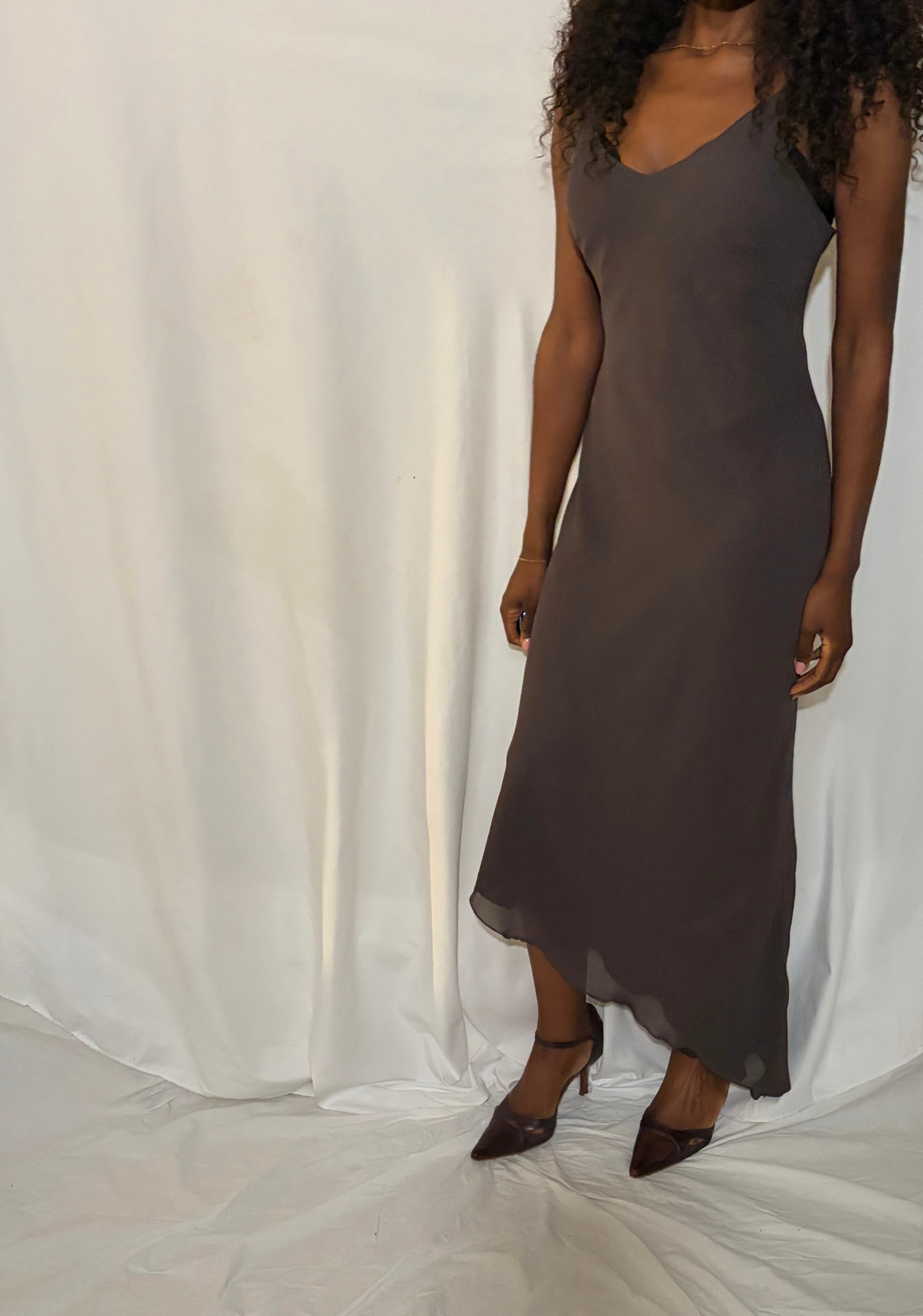 Vintage designer asymmetrical hem dress from Mari Philippe. Dusty brown/grey colour, effortlessly striking, perfect mix of sexy and classy.