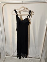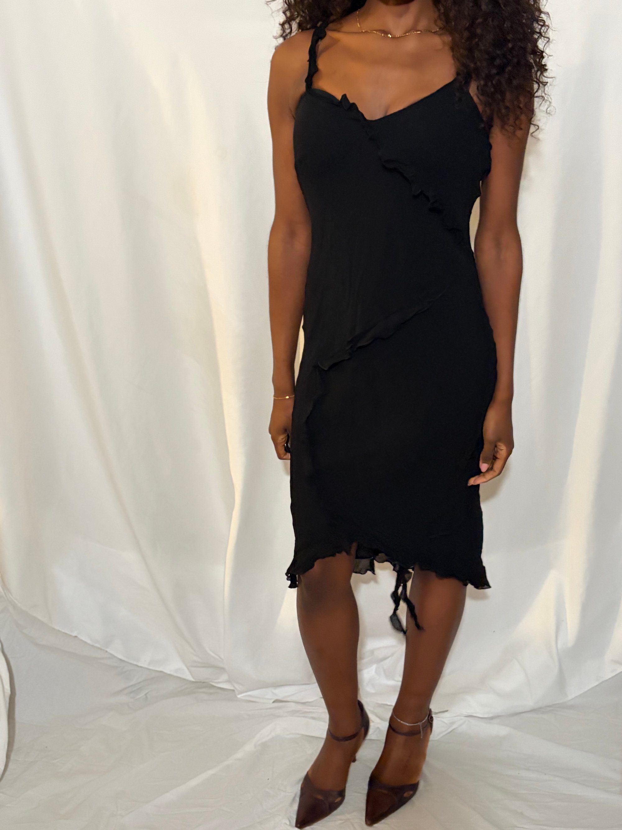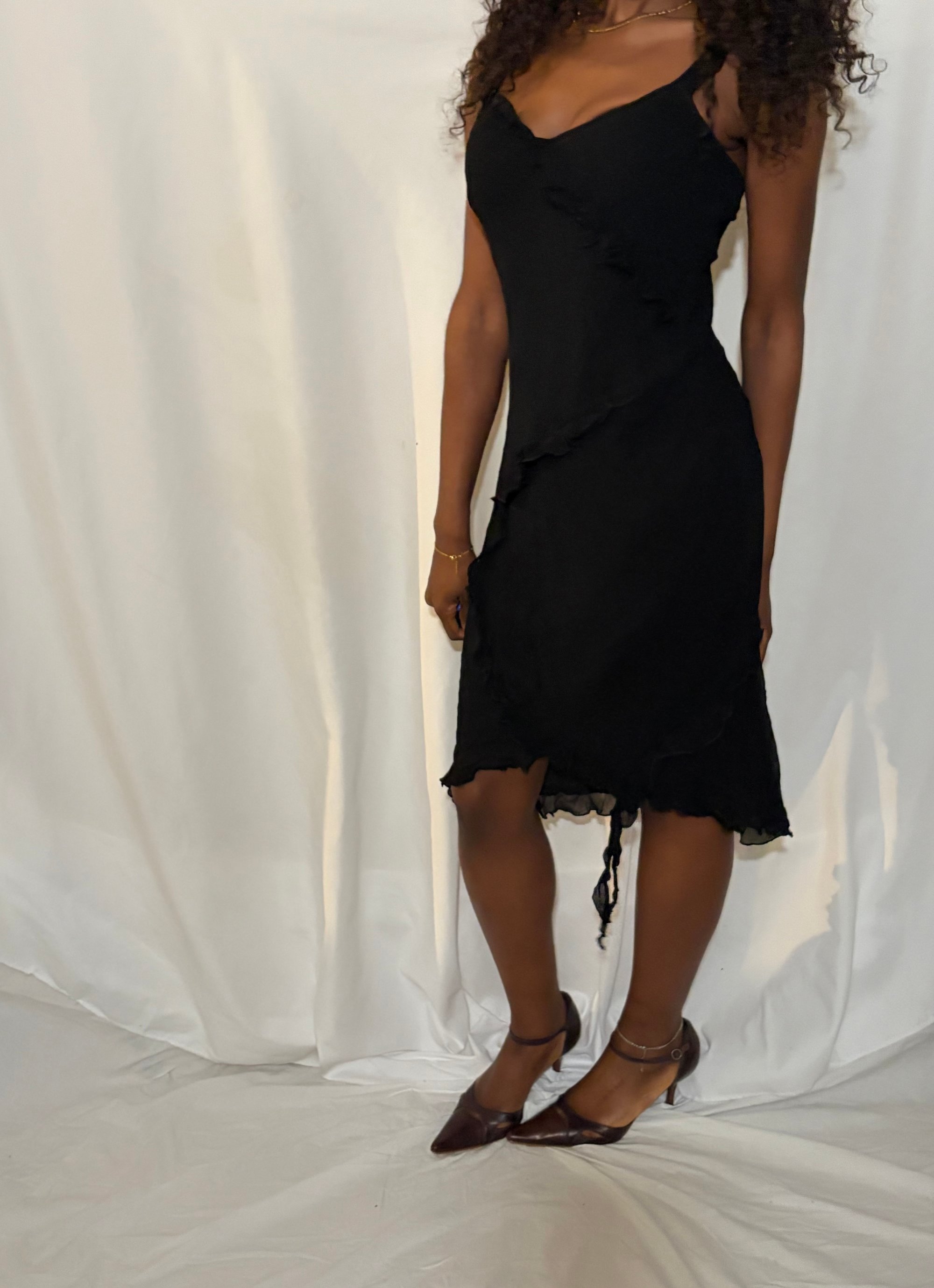 A black gothic-whimsy fairy dress, features a floaty bottom, and subtle ruffle detailing for a romantic, ethereal feel.