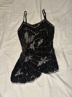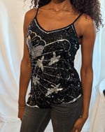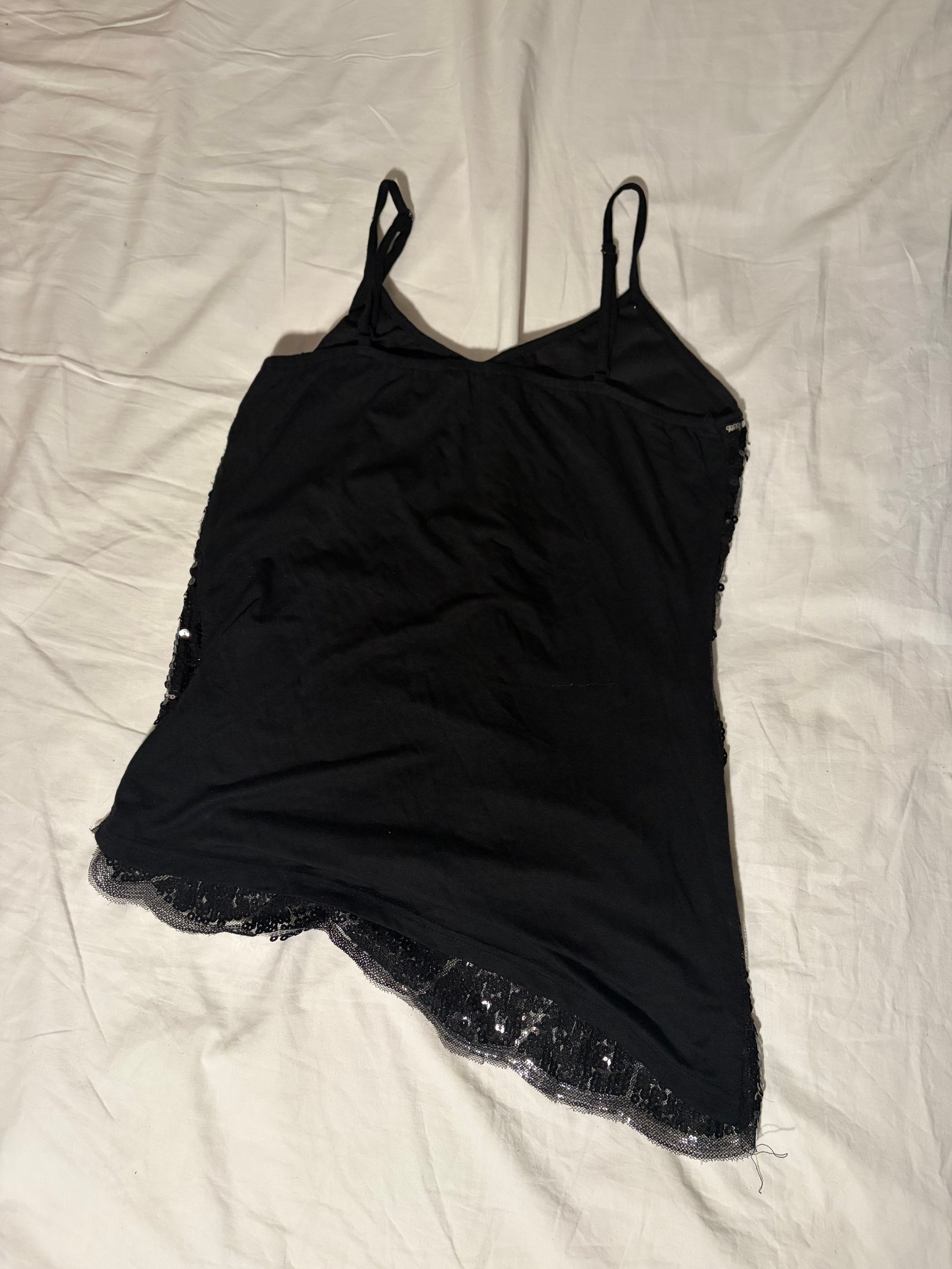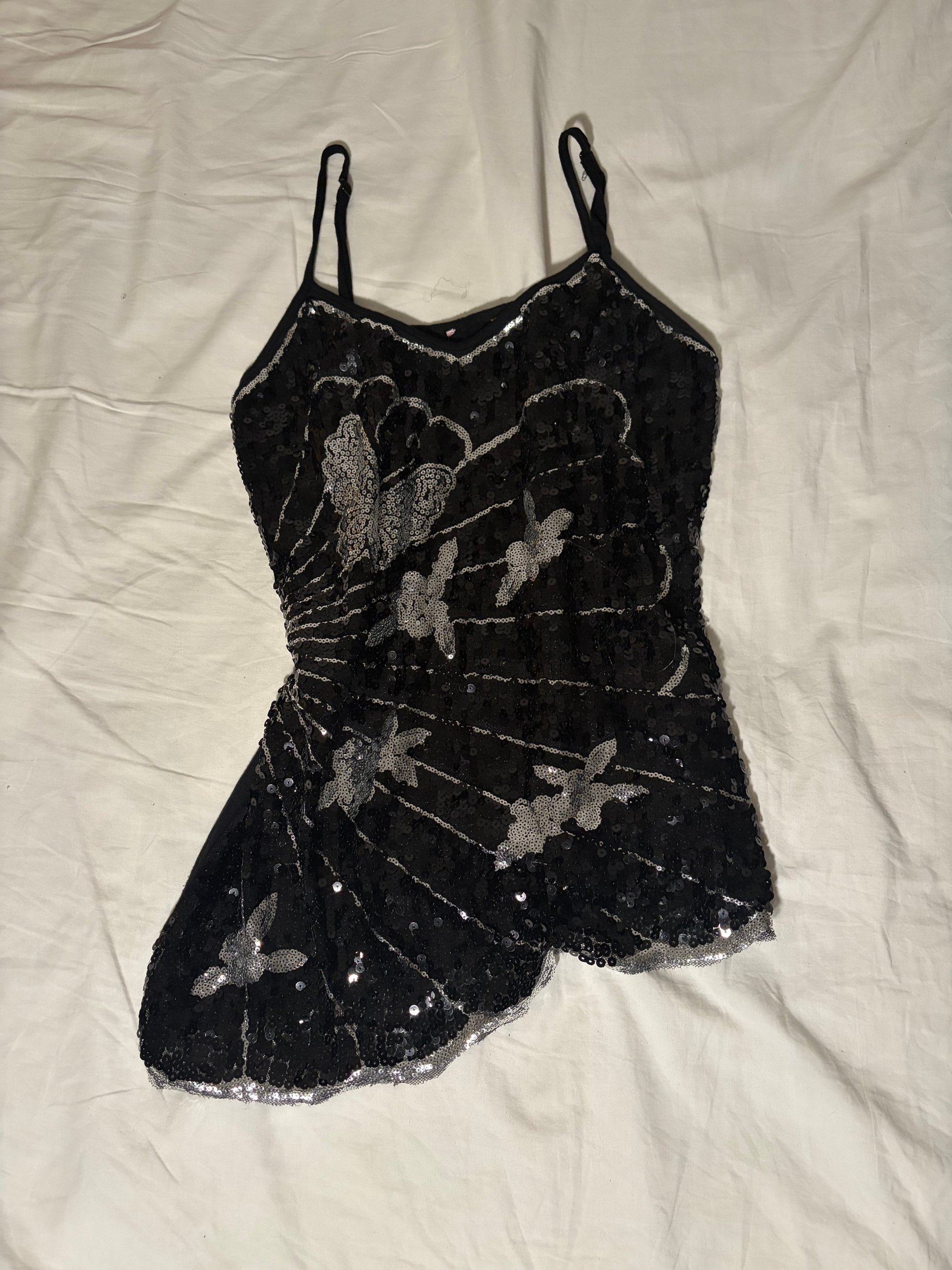 Y2K black and silver sequin butterfly cami, asymmetrical hem size UK 8 - 10