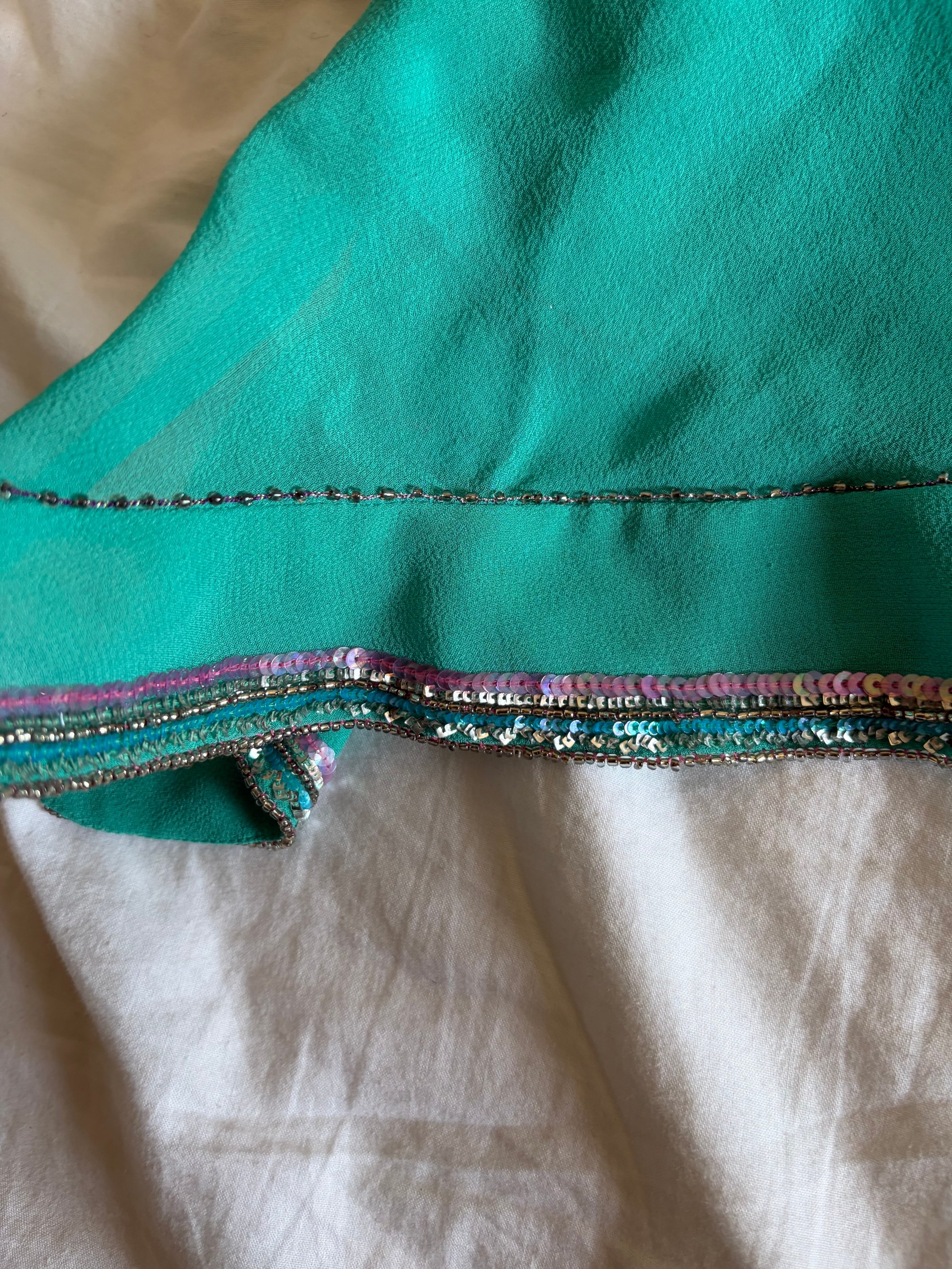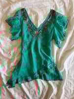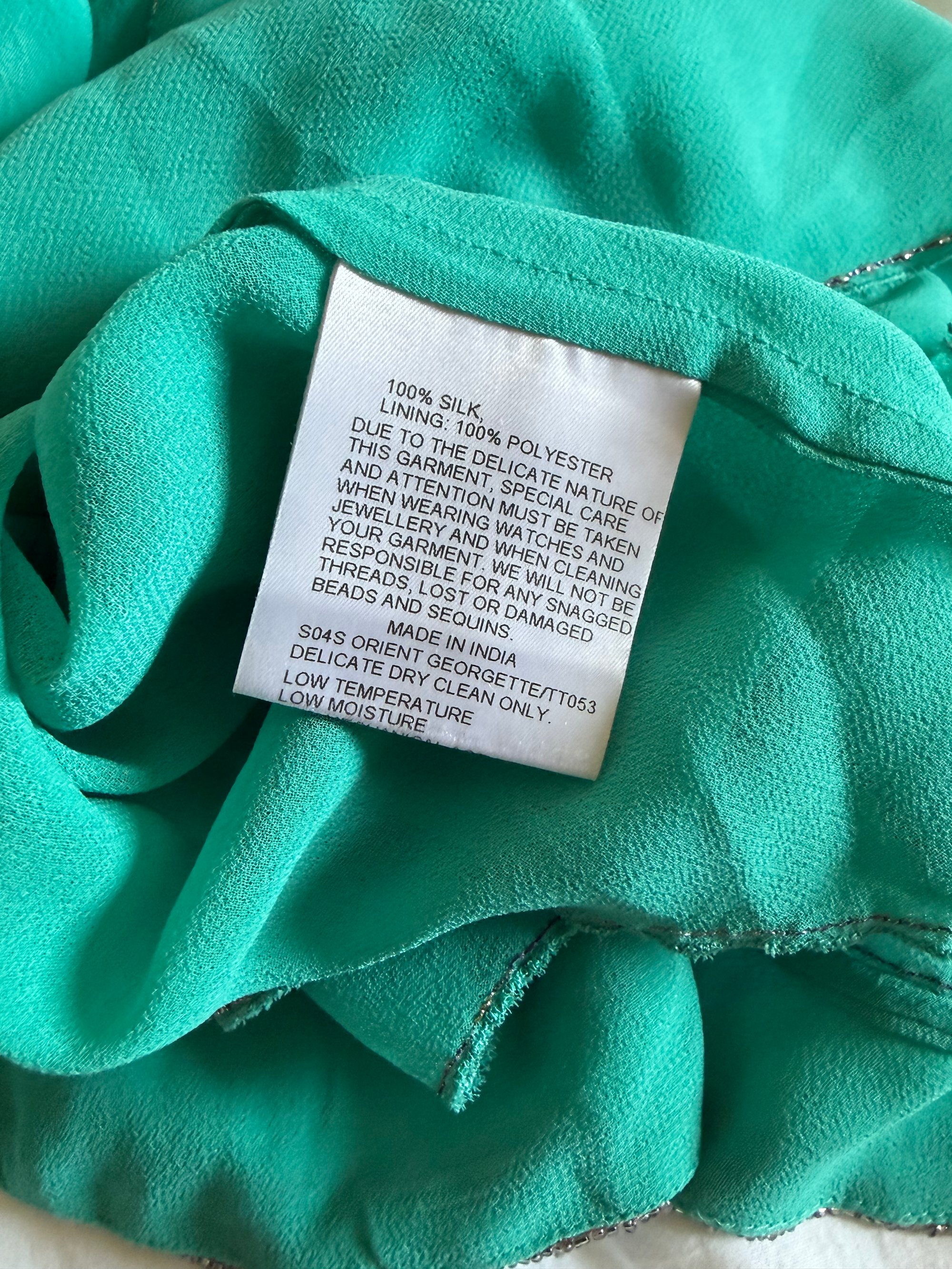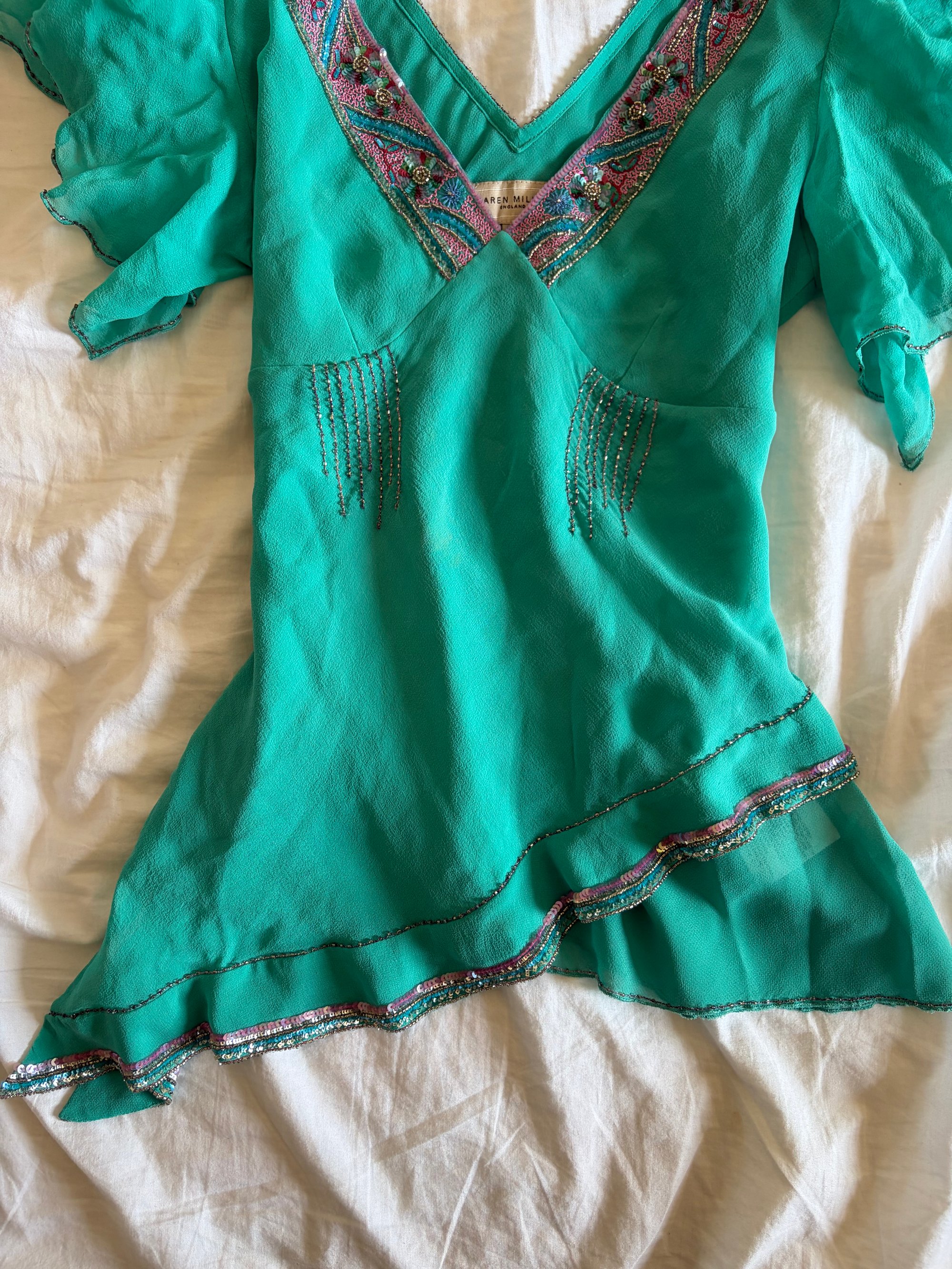 Vintage Y2K 2004 Karen Millen aqua blue silk embellished asymmetrical hem top