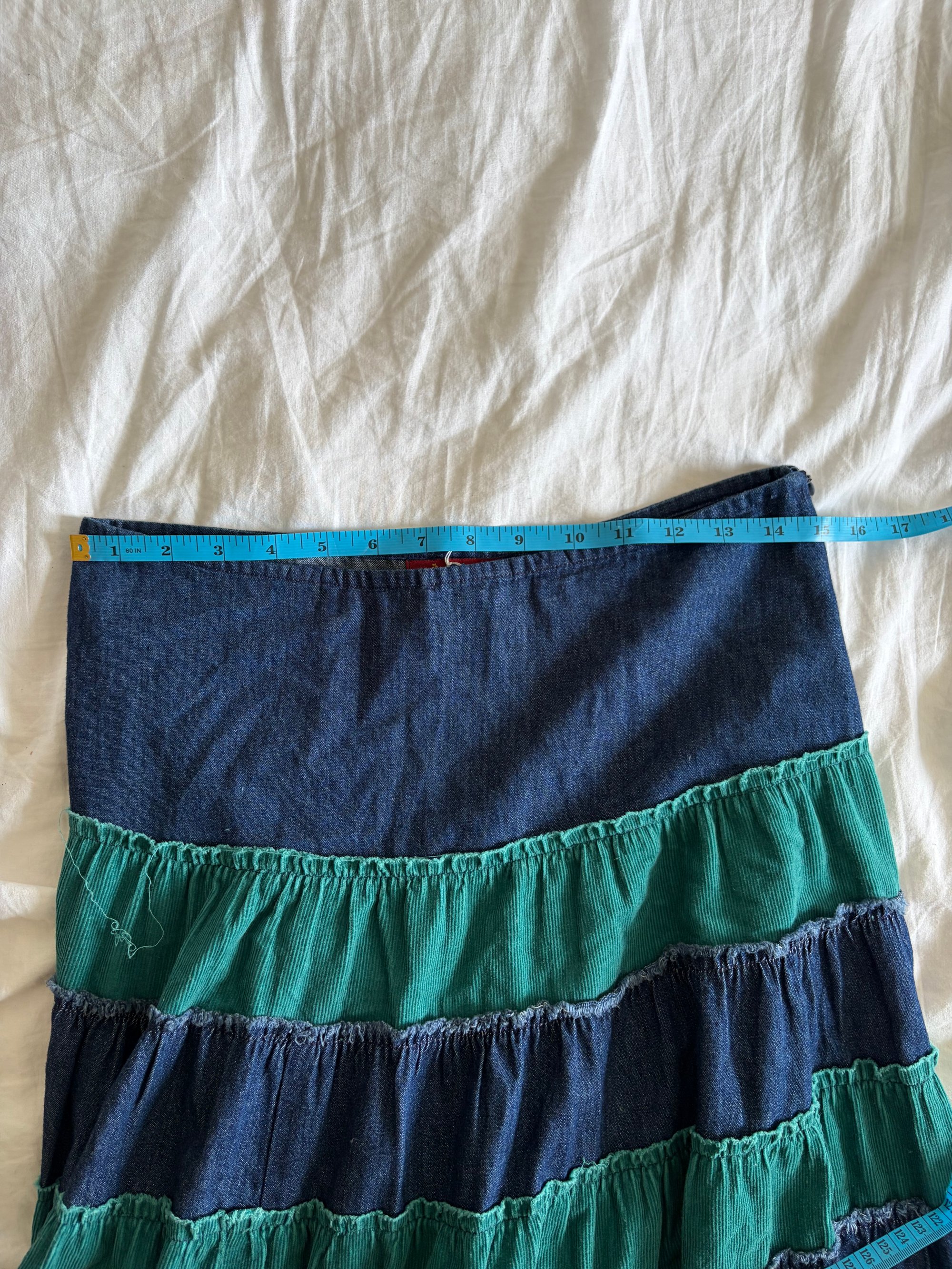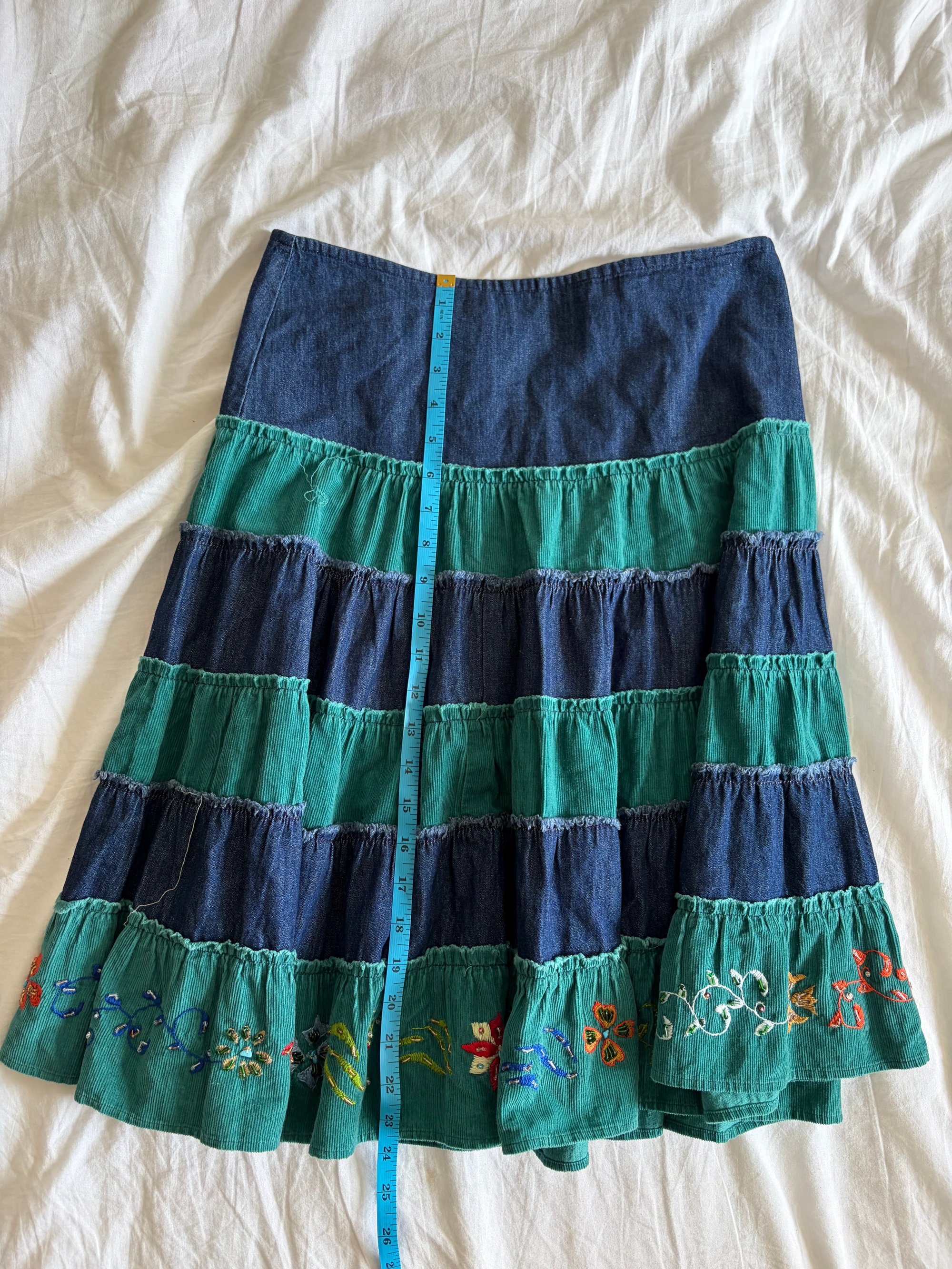 Vintage Y2K denim and cord contrast midi skirt with embroidered hem with beading