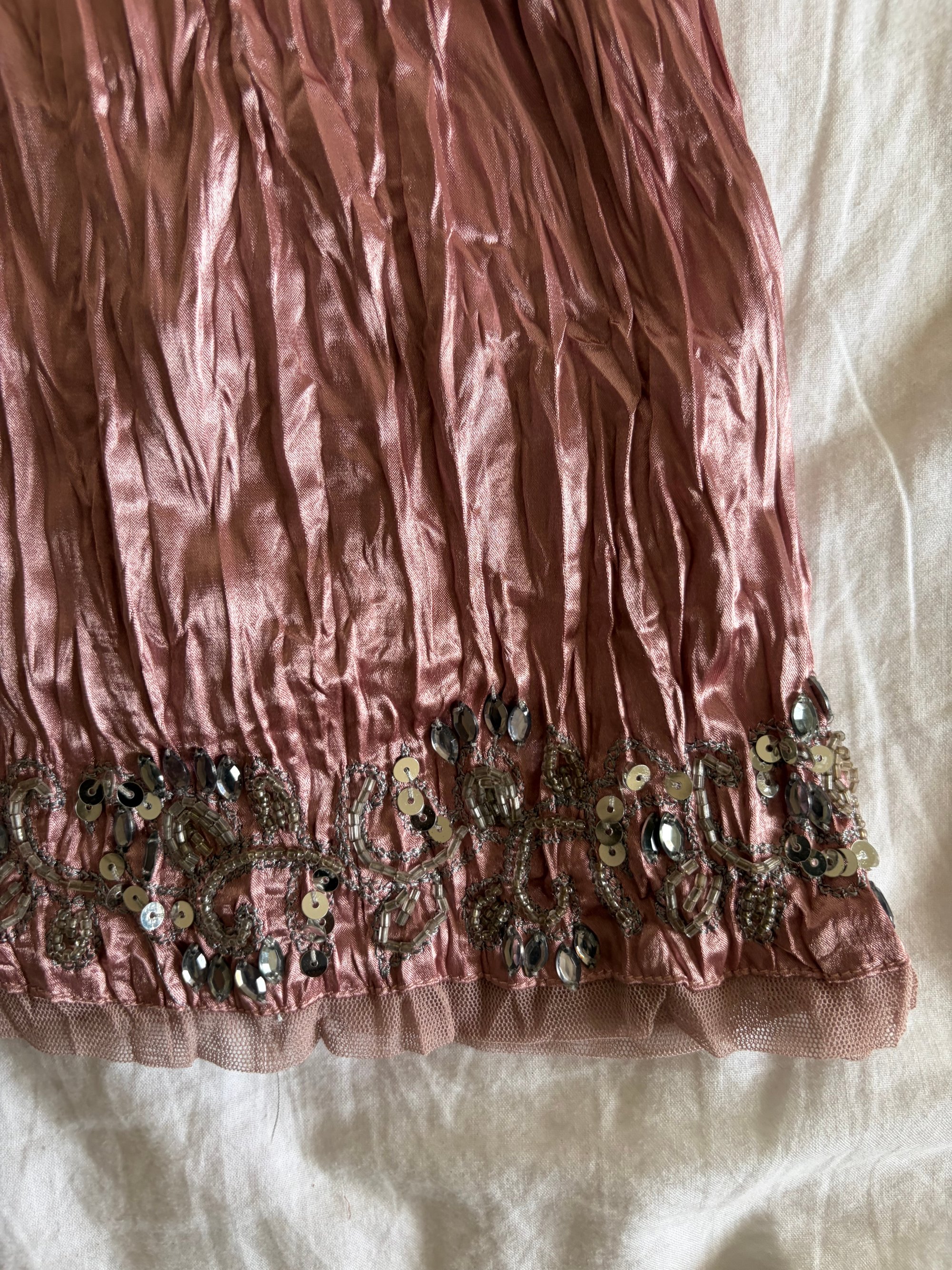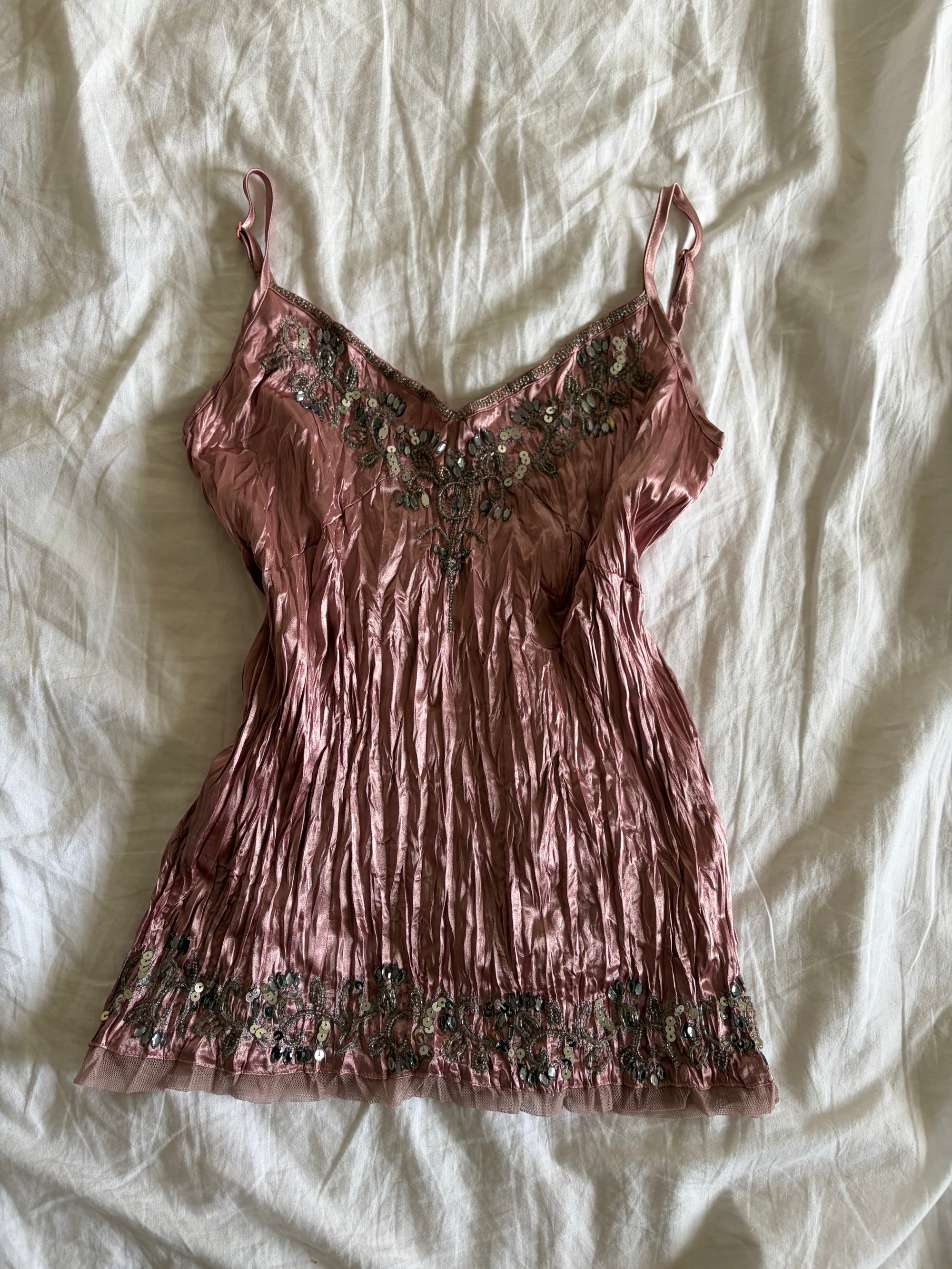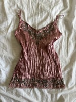Vintage Y2K rare dusty pink crinkle cami with gun mental grey embellishment and micromesh hem