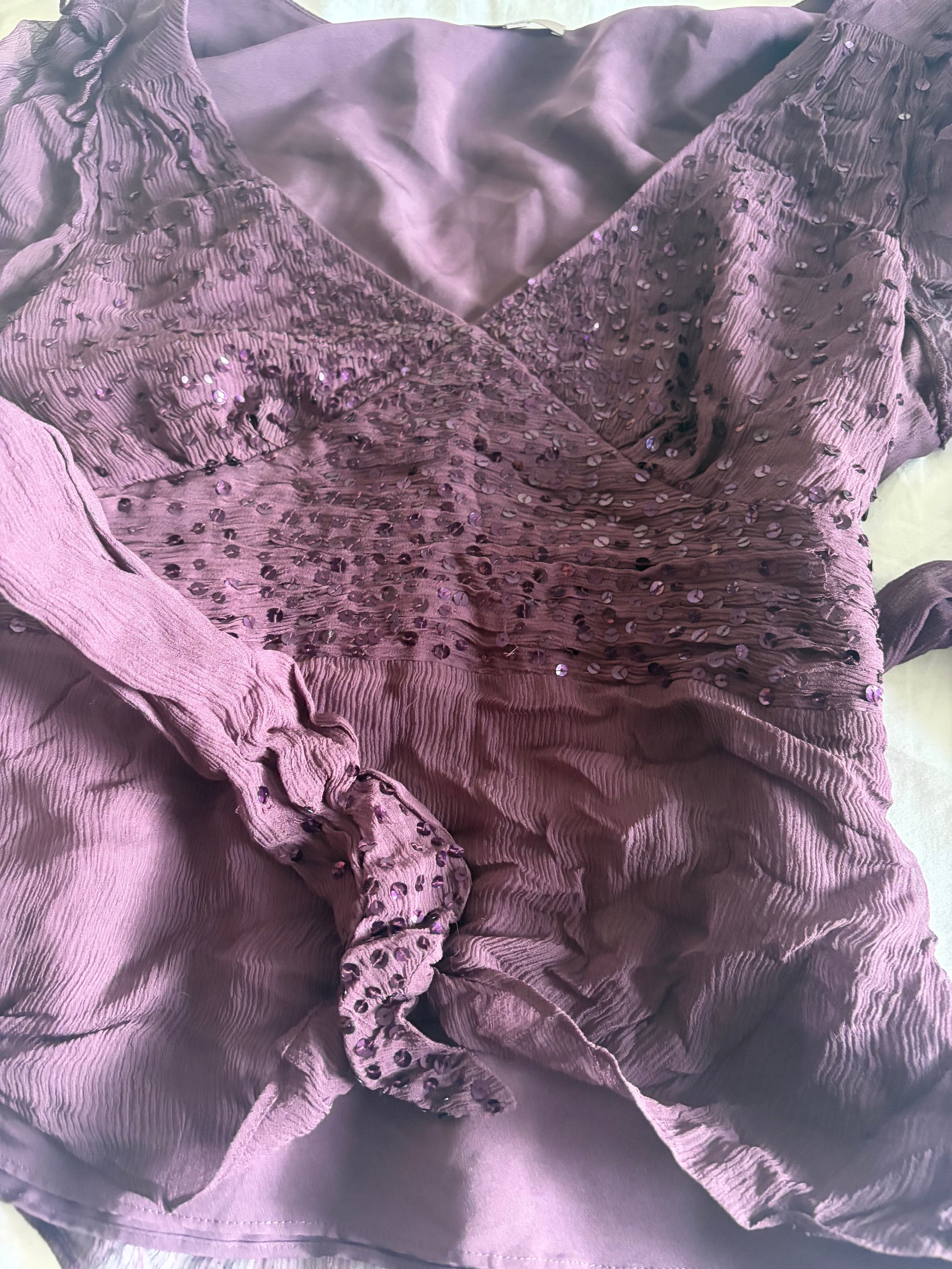 Y2K 00s silk purple gothic whimsy sequin top with side ties. Sequins on the side ties too.